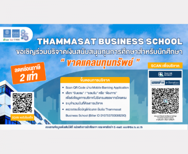 คณะพาณิชยศาสตร์และการบัญชี มหาวิทยาลัยธรรมศาสตร์ ได้จัดสรรทุนการศึกษาเพื่อช่วยเหลือนักศึกษาที่ขาดแคลนทุนทรัพย์ โดยตั้งเป็นกองทุนการศึกษาให้แก่นักศึกษาคณะฯ ซึ่งมีนักศึกษาประสบความเดือดร้อนยื่นความจำนงขอรับทุนจากคณะฯ เฉลี่ยปีการศึกษาละ 80 – 100 คน เป็นจำนวนเงิน 5,000,000 บาทต่อปีการศึกษา โดยประมาณ         เพื่อส่งเสริมและสนับสนุนนักศึกษาที่ขาดแคลนทุนทรัพย์ให้มีโอกาสศึกษาเล่าเรียนจนสำเร็จการศึกษาระดับปริญญาตรี คณะฯ ขอเรียนเชิญท่านร่วมบริจาคทุนการศึกษาแก่นักศึกษาของคณะฯ โดยสามารถบริจาคผ่านระบบ e-Donation มีขั้นตอนดังนี้ หากท่านต้องการใบเสร็จกรุณากรอกแบบฟอร์มได้ที่ https://forms.gle/ftAx8oaCfCRtGtkR6 สอบถามข้อมูลเพิ่มเติมได้ที่ หน่วยกิจการนักศึกษาฯ คณะพาณิชย์ฯ E-mail: ccc@tbs.tu.ac.thRead more