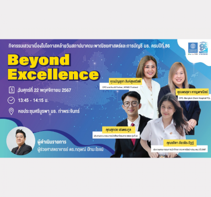 ในโอกาสวันคล้ายวันสถาปนา คณะพาณิชยศาสตร์และการบัญชี มหาวิทยาลัยธรรมศาสตร์ ครบปีที่ 86 ในวันศุกร์ที่ 22 พฤศจิกายน 2567 นี้ คณะกำหนดจัดเสวนา Beyond Excellence โดยศิษย์เก่า