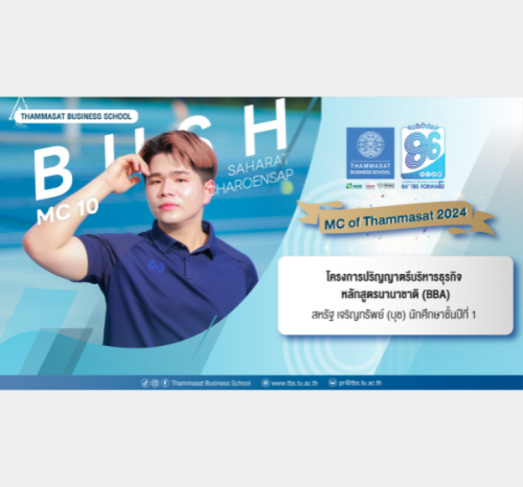 คณะพาณิชยศาสตร์และการบัญชี ม.ธรรมศาสตร์ ขอแสดงความยินดีกับ สหรัฐ เจริญทรัพย์ (บุช) นักศึกษาชั้นปีที่ 1 โครงการปริญญาตรีบริหารธุรกิจ หลักสูตรนานาชาติ (BBA) ได้รับคัดเลือกเป็น พิธีกรแห่งมหาวิทยาลัยธรรมศาสตร์ MC of Thammasat 2024