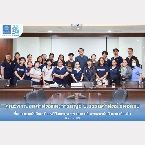 21 สิงหาคม 2567 หน่วยกิจการนักศึกษาและให้คำปรึกษาทางวิชาชีพ คณะพาณิชยศาสตร์และการบัญชี มหาวิทยาลัยธรรมศาสตร์ จัดอบรม ขั้นตอนดูแลนักศึกษาที่อาจมีปัญหาสุขภาพ และเทคนิคการดูแลนักศึกษาในเบื้องต้น ให้กับหน่วยงานภายในคณะฯ ท่าพระจันทร์ ที่มีส่วนเกี่ยวข้องในการดูแลนักศึกษา วิทยากรโดย ผู้ช่วยศาสตราจารย์บุรชัย อัศวทวีบุญ ผู้ช่วยอธิการบดีฝ่ายการนักศึกษา โดยมี ผู้ช่วยศาสตราจารย์ ดร.อรพรรณ ยลระบิล รองคณบดีฝ่ายวิชาการและเครือข่ายพันธมิตร ให้การต้อนรับ ณ ห้องประชุม 500 ชั้น 5 คณะพาณิชย์ฯ ม.ธรรมศาสตร์ ท่าพระจันทร์
