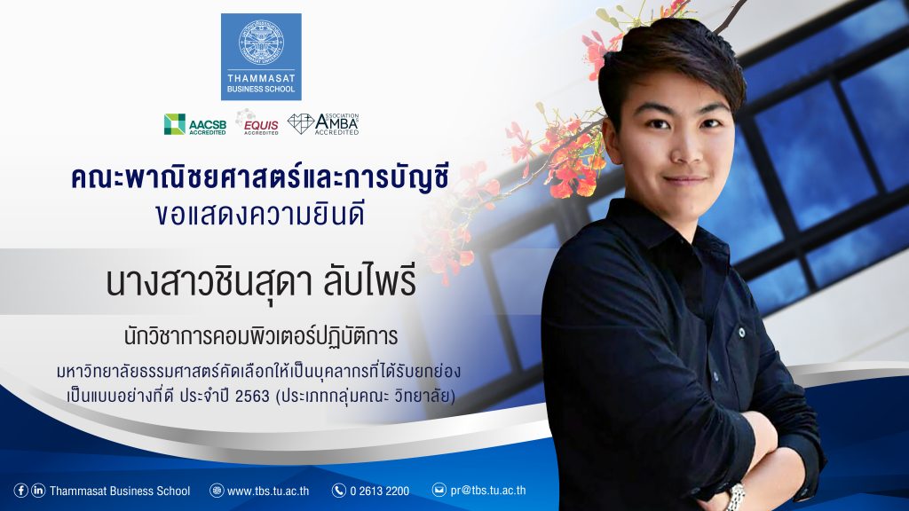 ขอแสดงความยินดีกับ นางสาวชินสุดา ลับไพรี นักวิชาการคอมพิวเตอร์ปฏิบัติการ ที่มหาวิทยาลัยธรรมศาสตร์คัดเลือกให้เป็นบุคลากรที่ได้รับยกย่องเป็นแบบอย่างที่ดี ประจำปี 2563 (ประเภทกลุ่มคณะ วิทยาลัย)