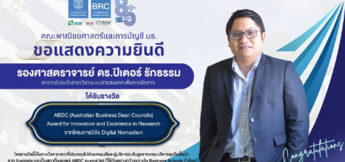 คณะพาณิชยศาสตร์และการบัญชี มหาวิทยาลัยธรรมศาสตร์ ขอแสดงความยินดีกับรองศาสตราจารย์ ดร.ปิเตอร์ รักธรรม คณบดี วิทยาลัยนานาชาติปรีดี พนมยงค์ และอาจารย์ประจำสาขาวิชาระบบสารสนเทศเพื่อการจัดการ (MIS) คณะพาณิชย์ฯ ม.ธรรมศาสตร์ ได้รับรางวัล ABDC (Australian Business Dean Councils) Award for Innovation and Excellence in Research จากโครงการวิจัย Digital Nomadism โดยรางวัลนี้เป็นรางวัลจากสภาที่ประกอบไปด้วยคณบดีและผู้บริหารระดับสูงจากคณะบริหารธุรกิจชั้นนำจาก Australia เเละเป็นสภาที่เผยเเพร่ ABDC journal list ที่ใช้กันอย่างกว้างขวางในมหาวิทยาลัยชั้นนำทั่วโลกอีกด้วย