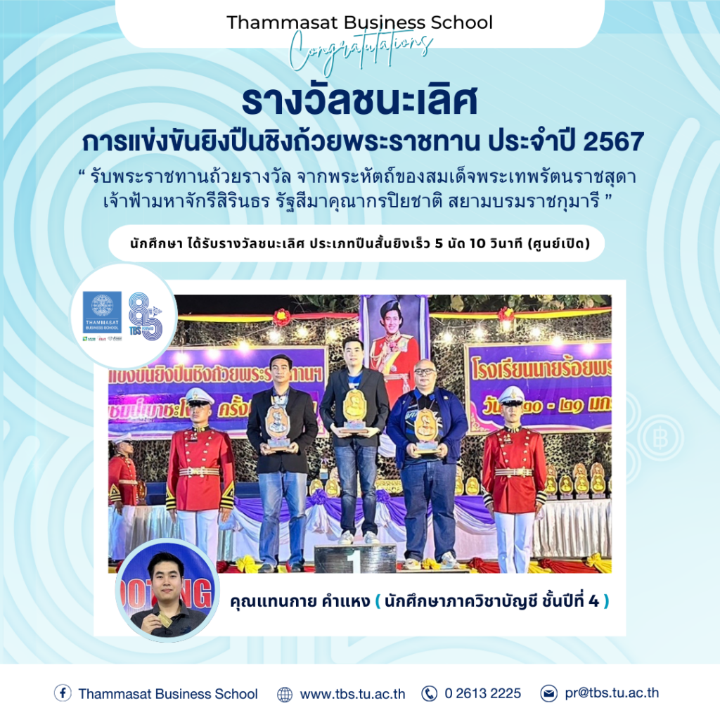 คณะพาณิชยศาสตร์และการบัญชี ขอแสดงความยินดีกับ แทนกาย คำแหง นักศึกษาภาควิชาบัญชี ชั้นปีที่ 4 ที่ได้รับรางวัลชนะเลิศ ประเภทปืนสั้นยิงเร็ว 5 นัด 10 วินาที (ศูนย์เปิด) จากการแข่งขันยิงปืนชิงถ้วยพระราชทาน ประจำปี 2567 เมื่อวันที่ 21 มกราคม 2567 ณ สนามยิงปืนโรงเรียนนายร้อยพระจุลจอมเกล้า โดยได้เข้าเฝ้ารับพระราชทานถ้วยรางวัล จากพระหัตถ์ของสมเด็จพระกนิษฐาธิราชเจ้า กรมสมเด็จพระเทพรัตนราชสุดาฯ สยามบรมราชกุมารี