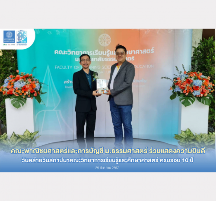 ผู้ช่วยศาสตราจารย์ ดร.กฤษณ์ ปัทมะโรจน์ พร้อมด้วย คุณราตรี แสงจันทร์ และคุณสุวิมล บัวผัน ผู้แทนเจ้าหน้าที่คณะพาณิชยศาสตร์และการบัญชี มหาวิทยาลัยธรรมศาสตร์ เข้าร่วมแสดงความยินดีกับคณะวิทยาการเรียนรู้และศึกษาศาสตร์ มหาวิทยาลัยธรรมศาสตร์ เนื่องในโอกาสวันคล้ายวันสถาปนาคณะวิทยาการเรียนรู้และศึกษาศาสตร์ ครบรอบ 10 ปี
