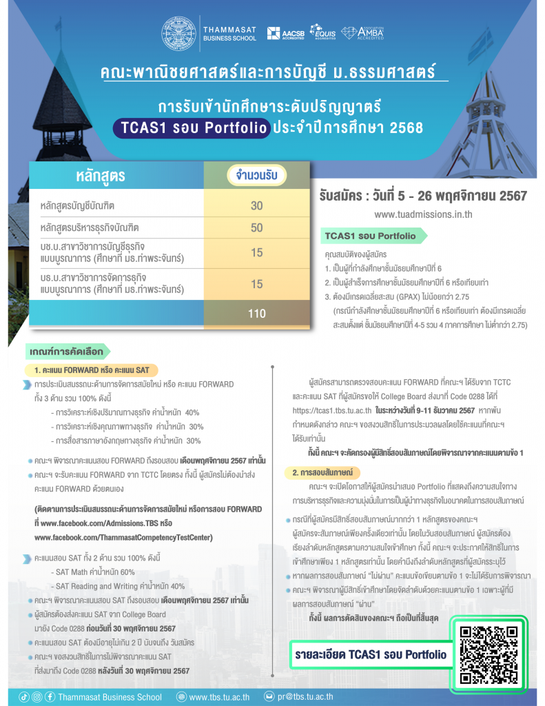 สอบถามรายละเอียดเพิ่มเติมที่คณะพาณิชยศาสตร์และการบัญชี มหาวิทยาลัยธรรมศาสตร์ โทร.02-696-5730 หรือ 095-709-8747 หรือ www.facebook.com/Admissions.TBS